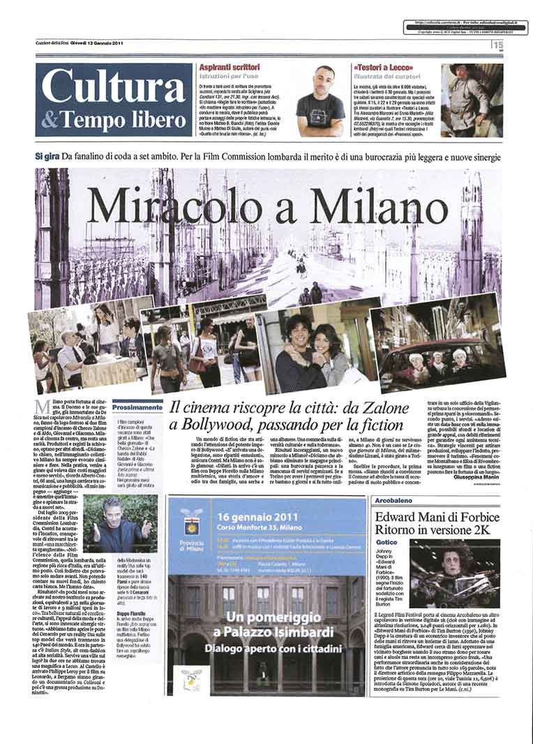 E’ stato un altro gap che andava colmato, e lo abbiamo fatto con l’eccellente supporto tecnico di Labmedia di Alessandra Alessandri. Da quelle analisi è pure emerso che la Lombardia è la prima regione d’Italia per fatturato audiovisivo, grazie alla presenza di Mediaset, Sky Italia, Discovery Channel, tutte aziende che cerchiamo di supportare per location e permessi. Il problema dei permessi rimane grave, perché nonostante i documenti che ho fatto circolare da almeno tre anni ispirandomi all’esperienza della Film Commission Torino/Piemonte (sportello unico on-line con permessi concessi in pochi giorni…), siamo di fatto ancora agli annunci. Finalmente a Milano sono state messe le basi dello lo sportello unico degli eventi culturali, ma la sostanza è che per l’occupazione suolo pubblico ci voglio ancora trenta giorni per sapere se la pratica è ok…Così abbiamo bypassato il tutto con i rapporti personali, fidando sulla sensibilità di alcuni dirigenti, anzi di alcune dirigenti, che ho soprannominato S.Giulia e S.Sabrina (Giulia Amato, direttore generale Assessorato alla Cultura del Comune di Milano e Sabrina Sammuri, direttore generale Assessorato alla Cultura della Regione Lombardia). Quando abbiamo un problema apparentemente irrisolvibile, una richiesta particolare di una produzione importante, la necessità di snellire la burocrazia per una urgenza imprevista…il loro immediato intervento risolve sempre, e grazie a loro abbiamo fatto tali miracoli per i primi cinesi e i primi indiani arrivati a Milano con diffidenza e richieste pazzesche. Girando tutto il mondo conoscono benissimo i problemi delle metropoli riguardo al cinema, e così sono rimasti stupefatti dalle soluzioni che siamo stati capaci di inventarci…e sono tornati. Le troupe di Bollywood in due anni sono state così oltre 14, e ora siamo già alla seconda grossissima cinese, di cui però non possiamo parlare, perché gli attori sono talmente famosi che tutta la comunità cinese di Milano accorrerebbe sui set, creando problemi di ordine pubblico e l’impossibilità di girare… Con la grande crisi del cinema italiano (per ora al box office siamo a -10% in attesa del Natale) proprio grazie all’apertura verso India e Cina, abbiamo potuto recuperare un grande indotto grazie alle produzione straniere. Che oltretutto vengono volentieri perché, dopo le prime esperienze, sanno che a Milano possono noleggiare qualsiasi apparecchiature tecnica, anche la più sofisticata. E qualsiasi servizio di assistenza. Inclusa la nostra. Che è fatta tutta di rapidità, conoscenza, consulenza di qualità, e di molto “management by exceptions”. La capacità di adattarsi è una dote nota degli italiani, che i giovani collaboratori delle Film Commission italiane che incontriamo spesso nei seminari comuni organizzati dal Coordinamento Nazionale, uniscono a competenza, passione, entusiasmo. Pur essendo concorrenti, gioiamo dei successi degli altri e cerchiamo di imparare da quelli e anche dagli errori. Per pare nostra abbiamo smentito un vecchio proverbio americano: “Non si può fare per la seconda volta una buona prima impressione!”. Noi ci siamo riusciti, ora la palla passa alla politica che dovrà designare i prossimi amministratori…