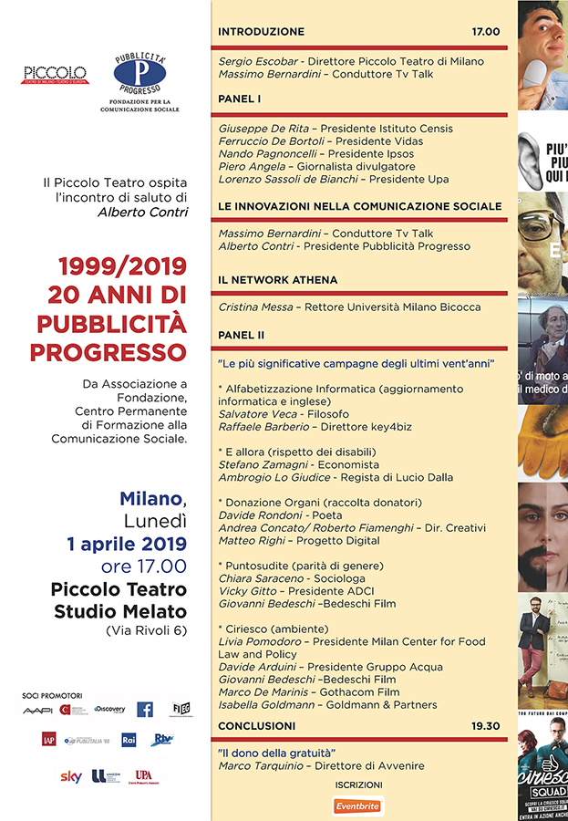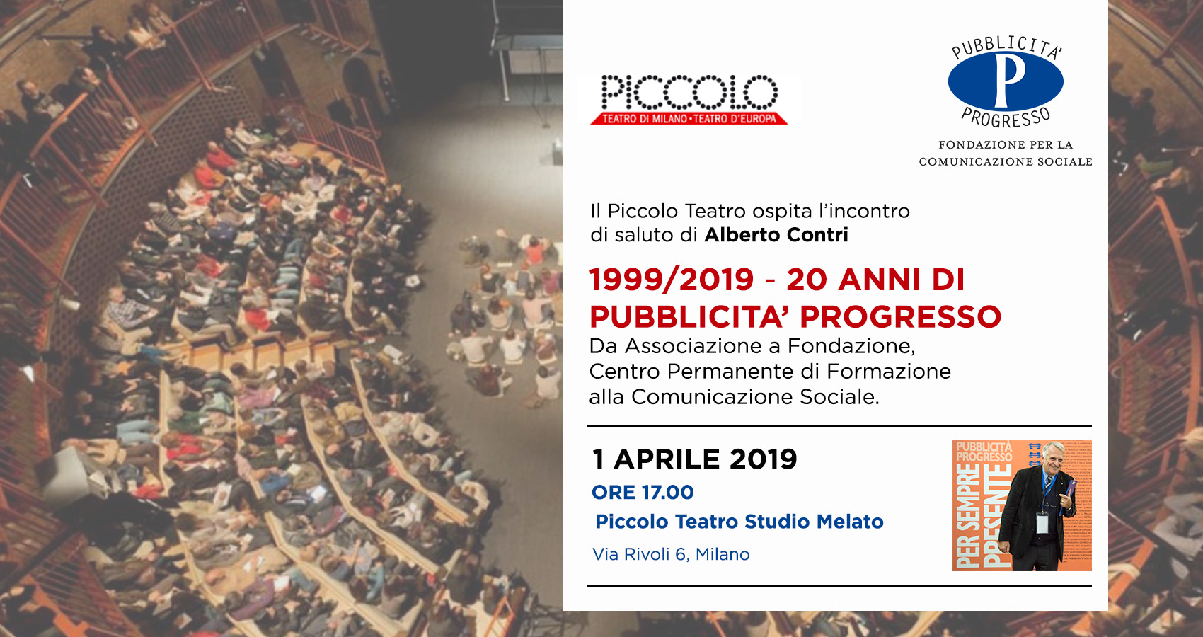 1 aprile 2019: l’evento conclusivo dei 20 anni di Pubblicità Progresso al Piccola Teatro di Milano