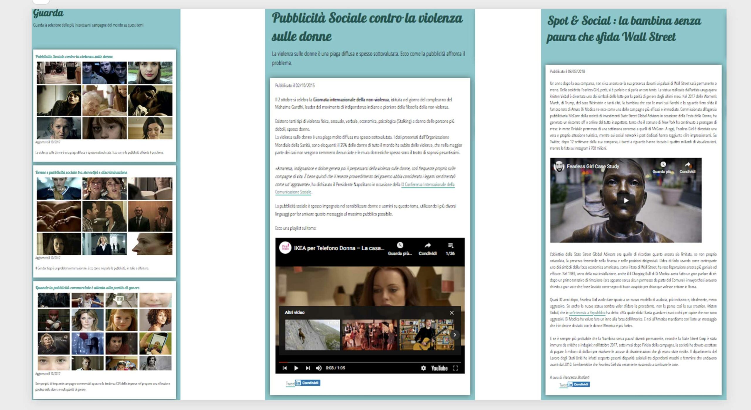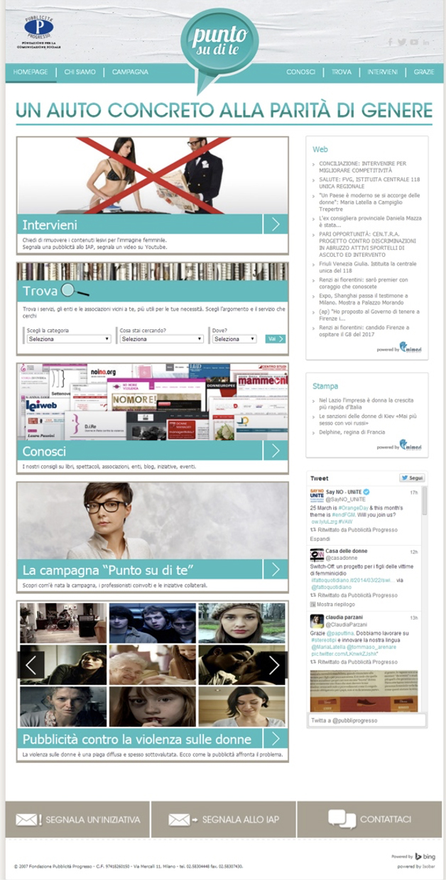 Entrambe le campagne puntavano ad un sito assai performante, che venne chiamato Puntosudite. Bastava inserire il nome della propria località per vedere apparire gli indirizzi dei centri antiviolenza più vicini, delle associazioni di aiuto alle donne, incluso i servizi di baby sitter per le madri al lavoro. Il motore di ricerca fu realizzato gratuitamente da Microsoft. Chiedemmo ad una società specializzata in rassegne stampa di segnalare e riportare giornalmente gli articoli sui temi della donna. C’era una rassegna delle migliori campagne sociali internazionali sul tema della parità e della violenza, la segnalazioni di libri, film, serie tv e spettacoli con la donna a tema. Non mancava uno spazio a disposizione delle donne per dialogare tra loro su varie tematiche. Studiato per poter continuare ad offrire un servizio in forma praticamente automatica (a parte qualche minimo aggiornamento) anche questo sito è stato inspiegabilmente chiuso…proprio nell’era dei social media.